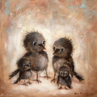 Kestosuosikkina töissäni seikkailevat varikset ja pingviinit, naivistiseen tyyliin tietysti. Muutenkin luontoaiheet ovat lähinnä sydäntäni mutta jos joku pyytää tekemään abstraktia teosta, olen täysiä mukana!